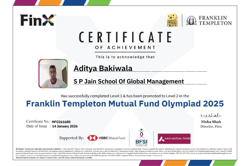 Aditya Bakiwala, a Master of Applied Finance and Wealth Management (MFWM) student at SP Jain Global, recently had the opportunity to do just that by participating in the Franklin Templeton National Mutual Fund Olympiad, a national-level competition that attracted over 10,000 students from 400+ colleges across India.